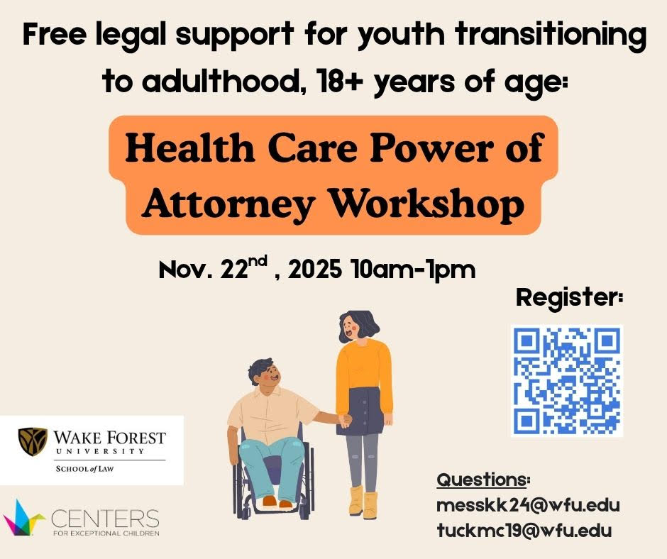 The Medical-Legal Partnership Clinic will host a free Health Care Power of Attorney (HCPOA) workshop on Saturday, November 22, 2025, from 10:00 a.m. to 1:00 p.m., at the Centers for Exceptional Children. This event offers the opportunity to create a free HCPOA with the Wake Forest Law team for youth transitioning to adulthood, or those 18 and older.